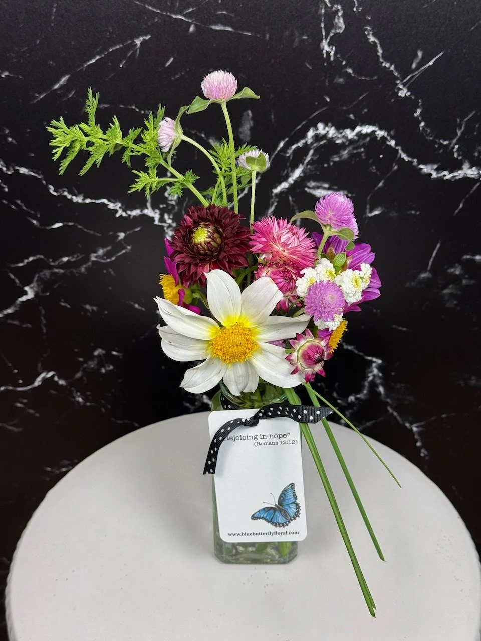Dainty floral bouquet that is delicately small and pretty. Comes in a honey jar ready to display in the perfect spot in your home. Flowers and floral designs will change throughout the growing season. Most flowers are grown locally from our suburban flower farm in Omaha, NE!